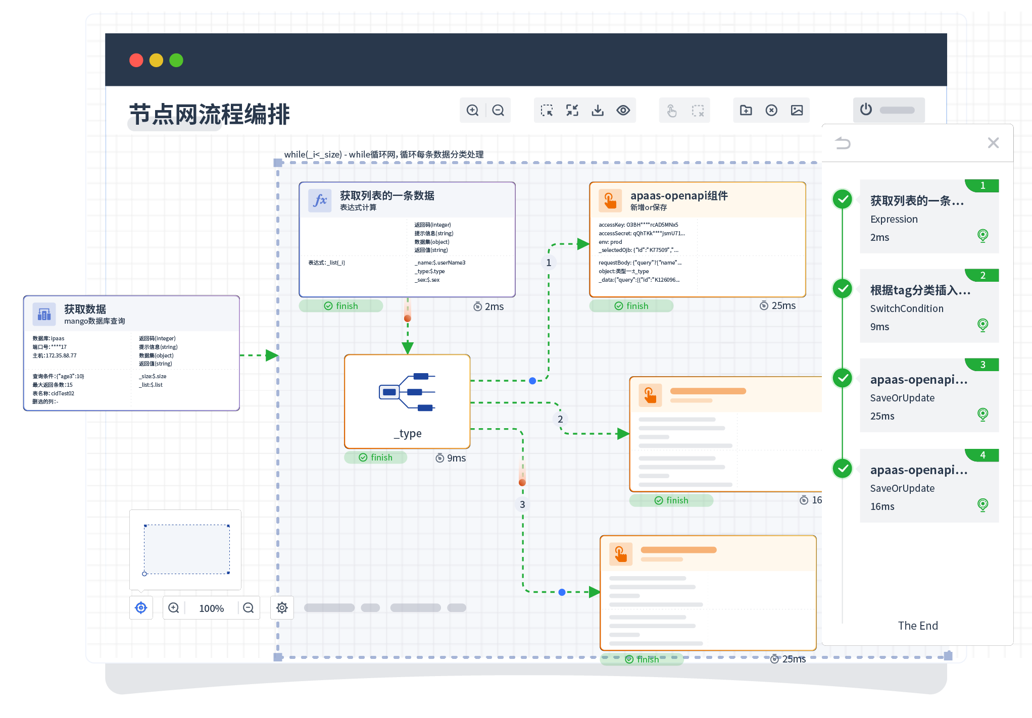 针对集成场景,,,,组件定义后支持进行流程编制,,,不同于传统代码方式,,,,通过图形化展示,,支持在线调试、、日志查看和运行回放。。