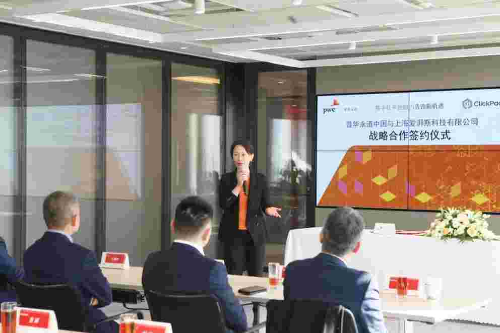 普华永道中国风险及控制服务数字化鉴证和分析服务主管合伙人吕麟晖与钱能钱包首席产品官马俊代表双方签订战略合作协议,,普华永道中国上海主管合伙人黄佳与钱能钱包创始人、、、CEO胡柏见证战略合作协议签订过程。。。。普华永道中国创智中心合伙人林榕作为项目总负责人主持并见证了本次战略合作签约仪式。。